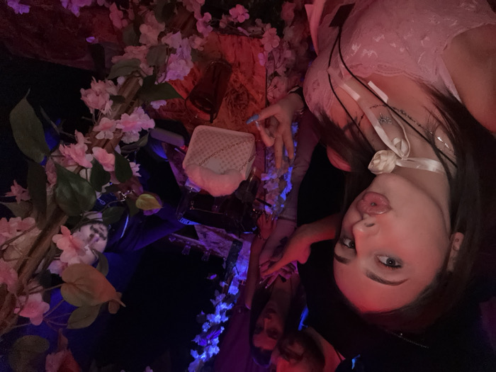 The image portrays an indoor scene within a nightlife establishment in Varna, Bulgaria, characterized by dim, colored lighting and extensive artificial floral decor. In the immediate foreground, a young adult female with long dark hair, wearing a light pink lace camisole and a cream-colored ribbon choker with a central rosette, faces the viewer. Her lips are puckered for a pose, and her left hand is raised in a three-finger gesture. Behind her, partially visible under red light, stands a male with a dark beard, wearing a dark shirt. To his right, another female in a light top is partially seen, appearing to focus on an object in her hands, possibly a mobile phone. The right side of the frame is dominated by artificial flowering branches with pink blossoms and green leaves, extending from the foreground to the background. Below these branches, a section of a counter or table is visible, draped with a red-patterned fabric. On this surface, a clear glass contains a dark beverage, and a small, light-patterned container with a fluffy white object sits next to it. Further in the background, a male with a beard is positioned behind a counter, holding a yellow citrus wedge, suggesting a bar or DJ station setup. The ambient lighting includes shades of red, blue, and purple, contributing to a themed, vibrant atmosphere.