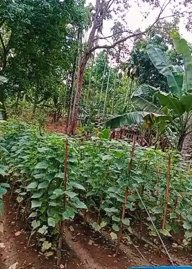garden with rows of cucumber plants supported by wooden stakes and twine. The plants have large, green leaves and are spaced evenly along the rows. Behind the cucumber plants are various trees, including tall, thin trees and banana trees. The ground is dark soil. The video is taken from a stationary position, providing a view of the garden and the surrounding trees. The lighting is somewhat overcast.