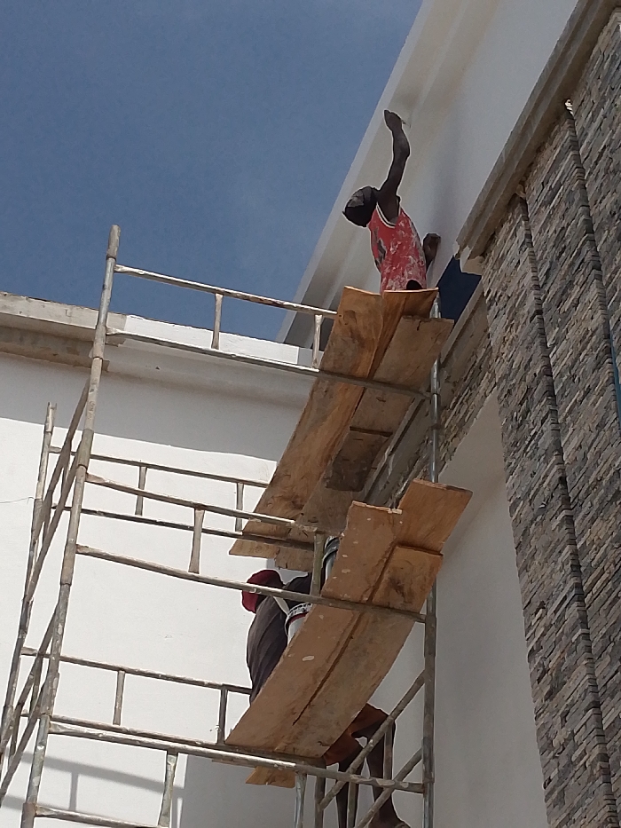 In Kwang, Nigeria, a daylight scene depicts two individuals engaged in exterior building work on multi-tiered metallic pipe scaffolding fitted with wooden plank platforms