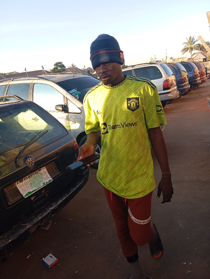 A man wearing a blue beanie, a neon green Manchester United jersey, and red Adidas pants stands next to a black car. He holds a phone in his left hand. The car has a "Plateau" license plate. Other cars are parked in the background, and a palm tree is visible in the distance. The ground appears to be dirt or asphalt. The lighting suggests it is daytime.