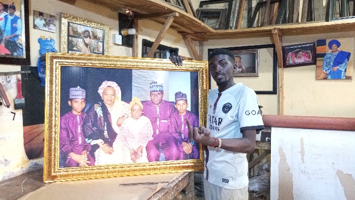 A man in a Paris Saint-Germain jersey holds a large framed portrait of a family dressed in formal purple attire. The portrait includes two parents and three children. The man is standing in a workshop with various framed pictures and framing materials in the background. Several other framed pictures are hanging on the walls. The workshop has a rustic feel with wooden structures.