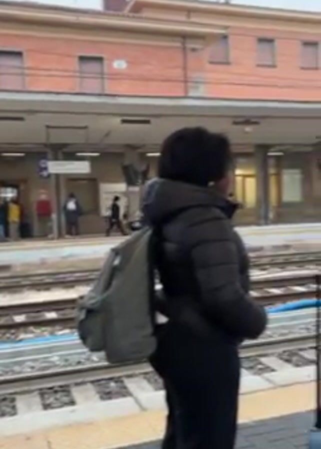 train platform on a slightly overcast day. People are waiting with luggage, including rolling suitcases, backpacks, and shopping bags. The platform has tiled flooring and is covered by a canopy. Railway tracks run parallel to the platform. A brick building with windows stands across the tracks. There are signposts indicating track numbers. Some people are standing alone, while others are in small groups, some appear to be talking. One person rolls a suitcase, others are looking at their phones.