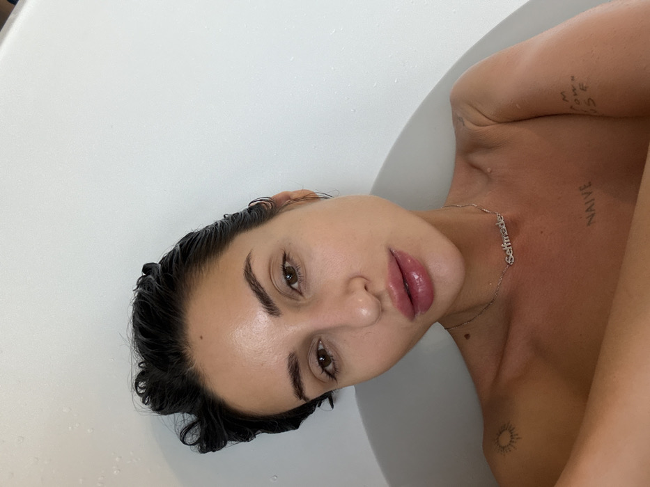 A light-skinned woman with wet, dark hair and dark eyebrows lies in a white tub, facing the camera. She wears a delicate silver necklace that reads "Selfmade." Tattoos are visible on her shoulder and chest. One tattoo says "NAIVE" while another is a small, circular design resembling a sun. Her lips appear glossy and full. The background is plain white, indicating the bathtub's material.