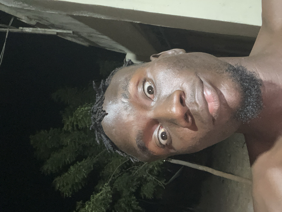 A close-up selfie of a dark-skinned man with short dreadlocks and a trimmed beard. His eyes are wide and slightly bloodshot. He appears to be outdoors at night, with foliage visible in the background. The image seems underexposed, with a dark sky behind the trees. Part of a white or light-colored structure appears above him. The lighting casts a sheen on his face.