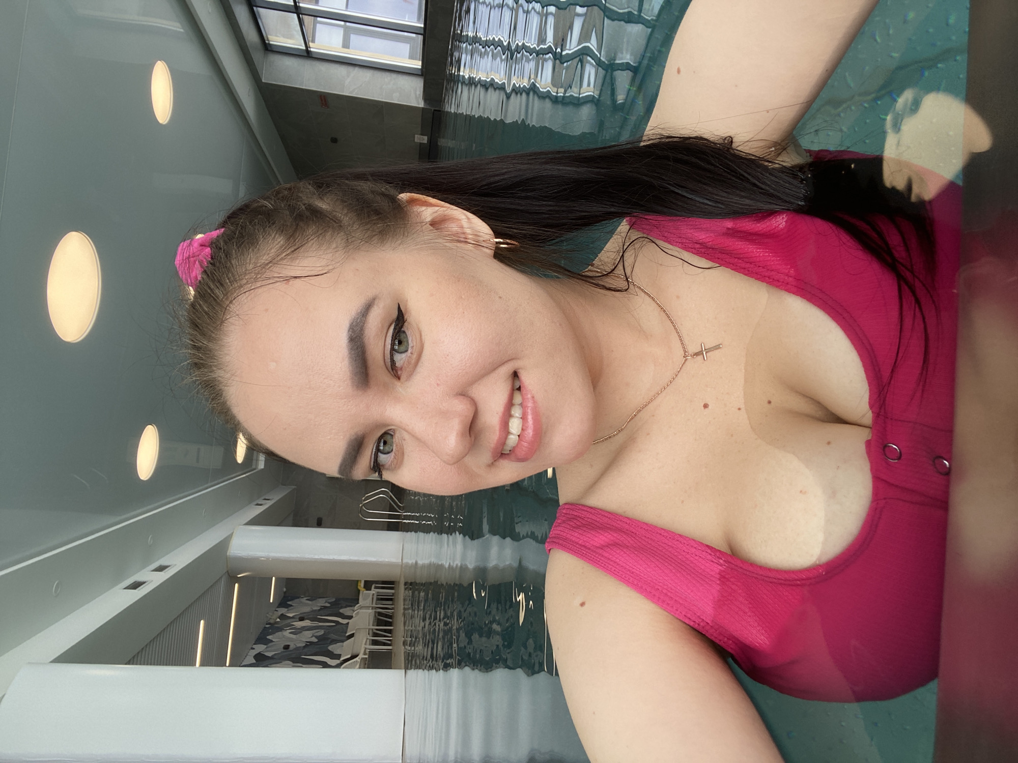A young woman is taking a selfie in a swimming pool. She is wearing a pink swimsuit and a gold cross necklace. Her hair is dark and wet. The pool is indoors, with large windows showing an urban view. The lighting is bright and even. The location is in Chaikovsky, Russia.