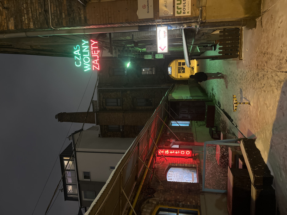 A narrow alleyway at night, lit by neon signs and overhead lights. "CZAS WOLNY" glows green, while "ZAJETY" is illuminated in red above. A "TATTOO" sign is also visible in red. The buildings lining the alley are brick and stone. A dark figure stands in the distance, near an arched entryway. The ground appears to be covered in snow. Signage for "Growbots" and other businesses are partially visible higher up.