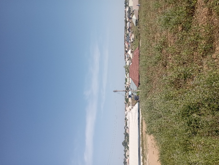 The image depicts an outdoor, wide-angle view of a semi-urban landscape in Rido, Nigeria, under a clear, bright blue sky with faint wisps of white clouds near the horizon