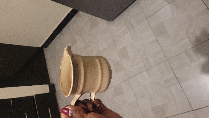 - "An individual's dark-skinned hand, with burgundy nail polish on short fingernails, is holding a light beige, textured ceramic pitcher or large mug by its handle" by FM-r7iU03, licensed under CC BY 4.0
