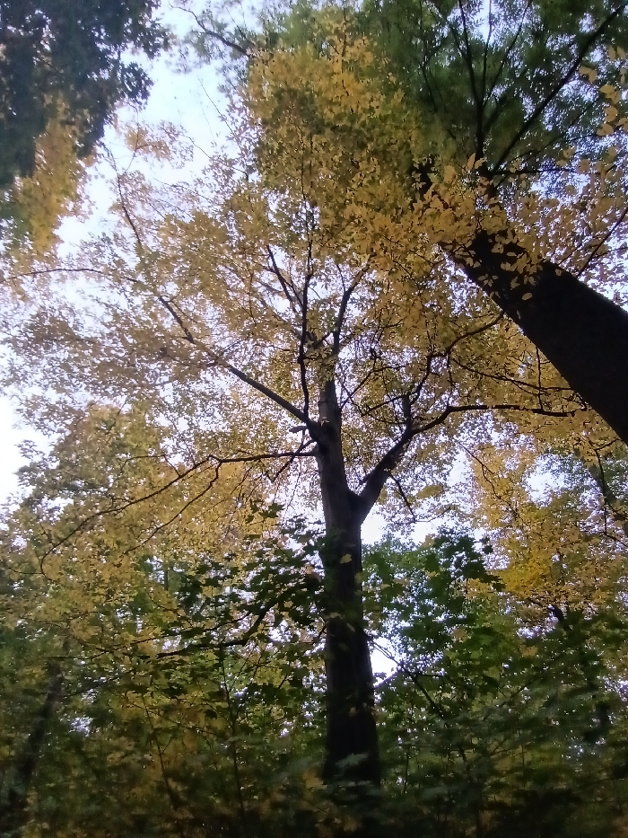 The image presents an upward view into a deciduous tree canopy, depicting a wooded area consistent with a park or forest in Leipzig, Germany. Multiple tall trees dominate the frame, exhibiting autumn foliage primarily in shades of yellow, with some green leaves remaining visible, indicating a transition season. Dark tree trunks and a network of branches are silhouetted against a light blue-grey sky, which is discernible through openings in the dense canopy. No human figures, animals, or artificial structures are present within the scene.