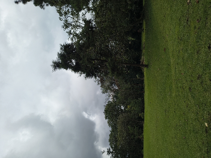 Lush green grass covers the right side of the frame. A line of trees with dense foliage forms a barrier between the grass and the sky. The sky is filled with grey and white clouds, indicative of an overcast day. The perspective is from a low angle, emphasizing the height of the trees.