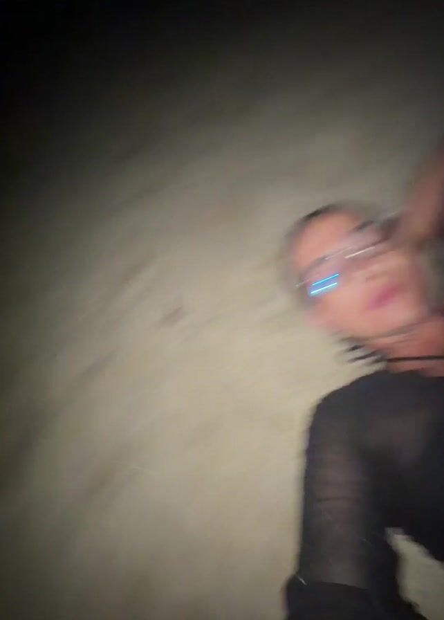 A woman with dark hair pulled back is lying on sand, wearing glasses, a black bra, a sheer top, and a choker. She appears relaxed, eyes closed, and her right arm is above her head. Behind her, partially out of focus, another person lies on the sand with a bottle of Heineken next to them. The scene is dark, suggesting nighttime. The camera angle is overhead, looking down on the woman.
