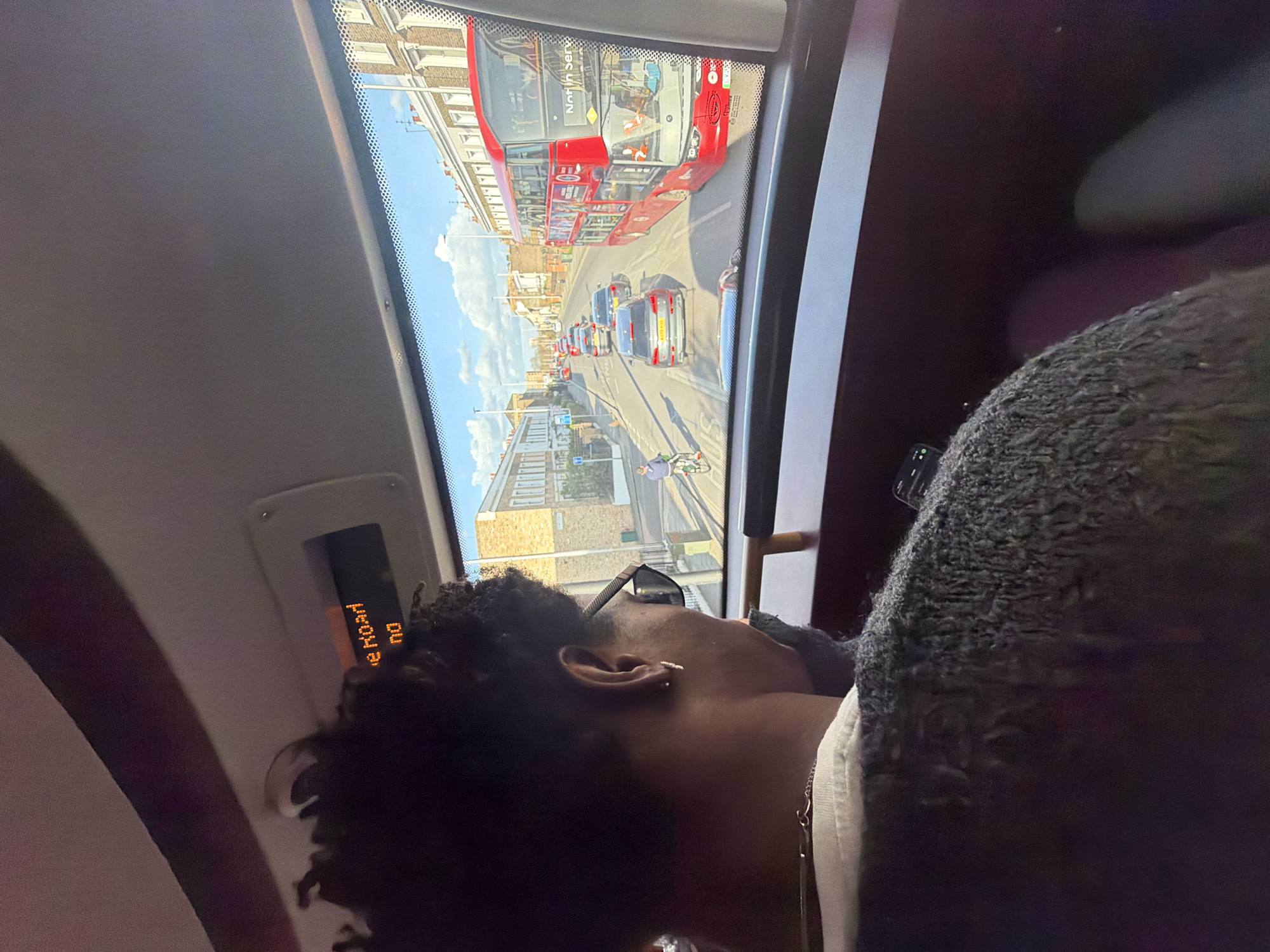 Inside a vehicle, a person is positioned near a window, seemingly asleep. The window offers a view of a street scene in London, United Kingdom, featuring a red double-decker bus, cars, and buildings under a partly cloudy sky. The bus has “North Service” printed on the top. A screen display inside the vehicle shows the words “The Road” in vertical orientation.