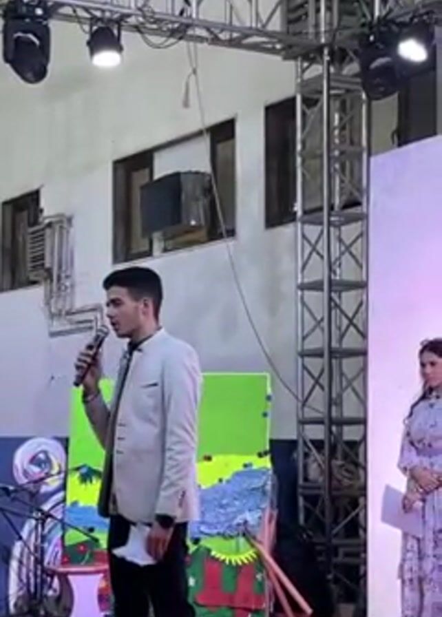 A group of people are on a stage in front of a screen, and one person speaks into a microphone. The speaker is a young man wearing a light colored blazer and black pants. He is holding papers in his hand. Behind him to his right is a woman holding papers as well. Behind them is a large screen displaying a logo and text in Arabic that translates to "Damascus International Book Fair 2024." To the left of the speaker is a hand-painted backdrop. As the camera pans to the right, four more people are seen standing on the stage: a girl in a pink sweater, two girls wearing hijabs, and a woman. The stage is covered in pink carpet. The background shows stage lights and metal staging infrastructure.