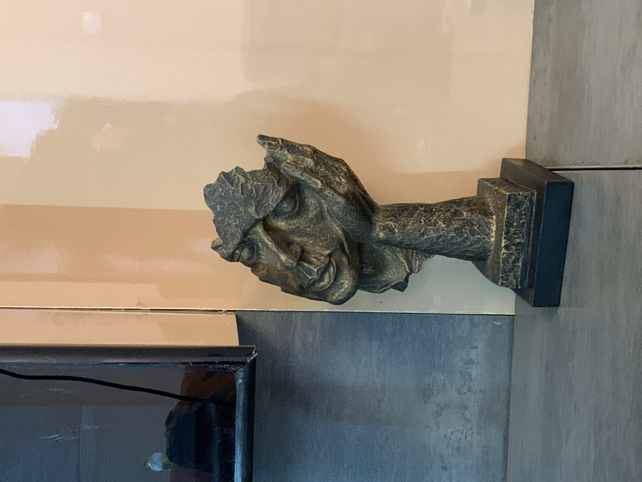 A textured, dark bronze-colored sculpture, approximately 30-40 cm tall, depicts a stylized human head with eyes closed, tilted slightly to the left, and a hand supporting the right side of the face. The top of the head appears fragmented or abstractly textured. The sculpture rests on a multi-tiered dark base, which is situated on a flat, matte grey-toned surface, possibly a countertop or shelf. A vertical seam is present in this grey surface to the right of the statue's base. To the right of the sculpture, a smooth, glossy light peach-colored wall or cabinet panel serves as the background. To the left, a portion of a dark, rectangular object, consistent with a television screen or monitor, is visible, reflecting a small, light-colored object (possibly a bottle) and displaying a thin black cable running vertically along its left edge. The background behind this dark object is a darker grey, similar in texture to the surface the statue occupies. The scene is brightly lit. Location: Unknown, Unknown.