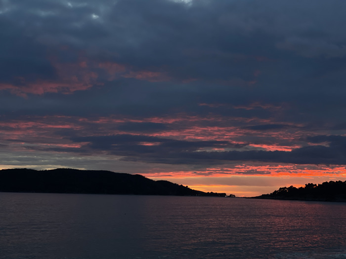 A tranquil, scenic shot features a sunset over water. Two land masses in silhouette frame the horizon, where the sun dips low, casting a bright orange glow. Above, the sky is layered with dark, moody clouds streaked with bands of pink and red, reflecting the sunset's vibrant hues. The water mirrors the dark tones of the land and clouds, creating a calming and dramatic visual balance.