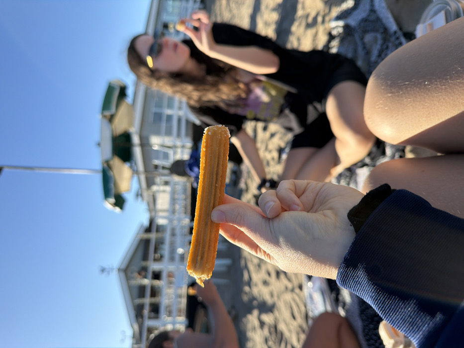 The image depicts an outdoor, daytime scene on a sandy beach under a clear blue sky in Pinamar, Argentina. In the foreground, a light-skinned human hand, oriented palm-upward, holds a single, golden-brown, ridged churro horizontally across the frame. The churro shows a slight dusting, consistent with sugar. The hand's wrist is covered by a dark blue ribbed fabric sleeve. Below the hand, the bare upper thighs of the person holding the churro are partially visible. In the midground, two individuals are seated on the sand, which is partially covered by dark-patterned blankets. To the right, a female with long, dark, wavy hair wears dark sunglasses and a dark t-shirt with a light graphic. She holds a small, light-colored food item near her mouth, appearing to be eating. To the left, another individual is partially visible from the shoulder to the upper arm, also seated and seemingly engaged in eating or an activity. The background features several light-colored wooden structures, characteristic of beach club buildings or similar establishments, with white railings and roofs. A prominent green and white striped beach umbrella is open behind the seated individuals. A tall metal pole, possibly a flagpole, extends vertically towards the top of the frame from behind the structures. A weather vane is discernible on the roof of one of the buildings. The overall environment is bright and sunlit.