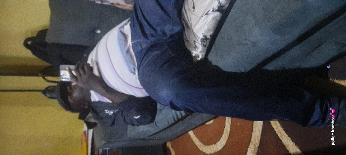 An adult male is depicted lying supine on a dark gray or blue upholstered couch within an unknown indoor setting, possibly a residence, at an unknown location in Unknown, Unknown. The individual, who appears to have dark skin, is wearing a dark cap, a dark jacket over a light-colored horizontally striped t-shirt, and dark blue jeans. He is holding a light-colored smartphone with both hands over his torso, actively observing its screen. His legs are extended along the couch. A light-colored patterned cushion is positioned under his right leg. In the background, a plain yellow wall is visible, with a dark backpack or bag resting on a surface or hanging to the upper right. A brown rug with light-colored, curvilinear patterns covers the floor in the foreground and to the left. The scene is illuminated by ambient lighting.