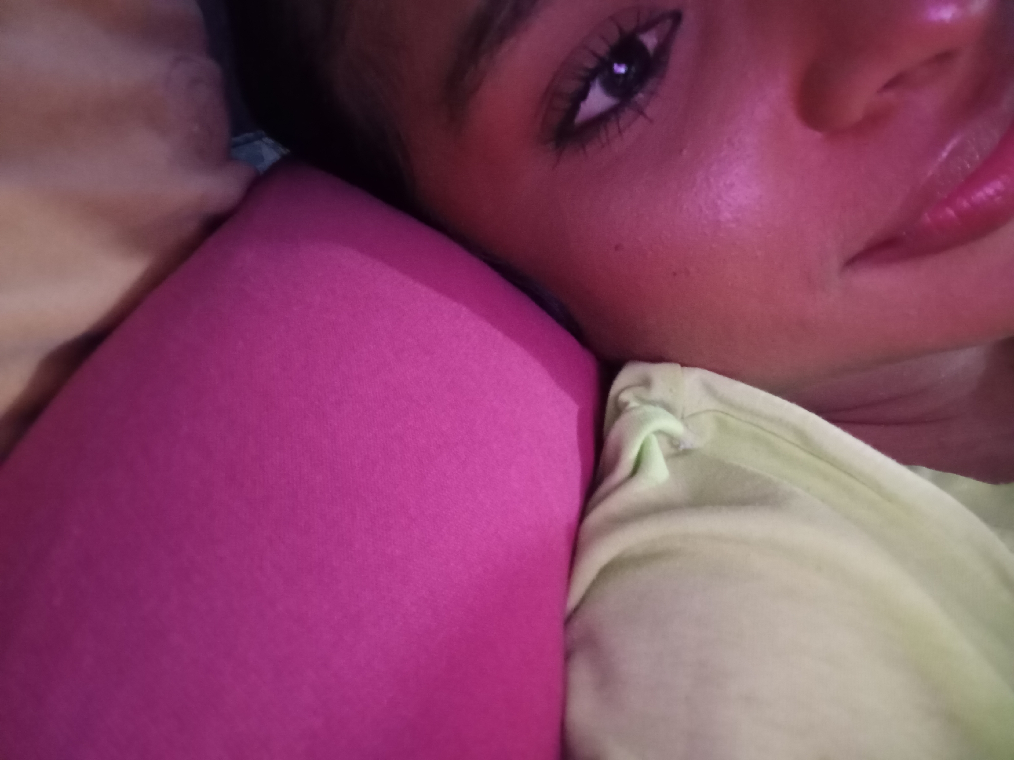 person's face close up. The person has dark hair, a dark eye with noticeable eyelashes, and lips that appear to have lip gloss on them. The person is lying on a pink pillow. A light green/yellow shirt or blanket is also visible. The photo was not taken in Juan Griego, Venezuela. There is no evidence to indicate that the image was taken there.