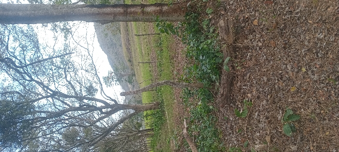 A horizontal outdoor shot reveals a grassy meadow bordered by trees. A weathered fence runs across the meadow. A mountain looms in the background. The foreground shows a forest floor covered with leaves and foliage. The trees have sparse branches reaching toward the sky. The overall scene conveys a rural, natural environment with elements of woodland and open pasture.