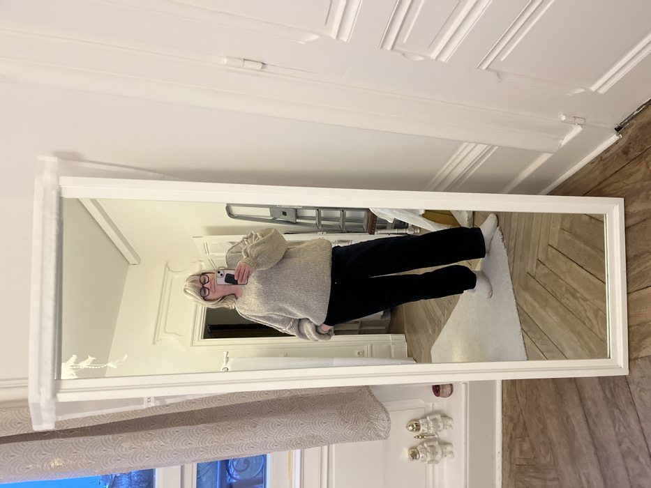A woman stands reflected in a large, white-framed mirror. She wears a beige sweater, black pants, and white socks, holding a phone up to take the picture. The mirror leans against a wall with decorative molding and a parquet floor. Reflected in the background is a white hallway, a ladder, and a glimpse of a window. The mirror's left side is covered in protective packaging. Window view.