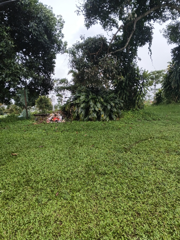 The scene depicts an outdoor environment in Unknown, Nepal, under an overcast sky. The foreground is dominated by a dense, uniformly green lawn. In the midground, towards the left, a discernible pile of refuse is present, composed of various discarded items including prominent red and white plastic bags and cardboard, situated at the base of mixed green foliage. A dark, slender vertical pole or stake is partially visible to the left of the refuse pile. The background and upper portions of the image are occupied by the canopies of several large, dark green trees and dense clusters of broad-leafed tropical plants. The sky is a uniform light grey, indicating heavy cloud cover. No individuals or animals are present, and no specific actions or interactions are depicted.
