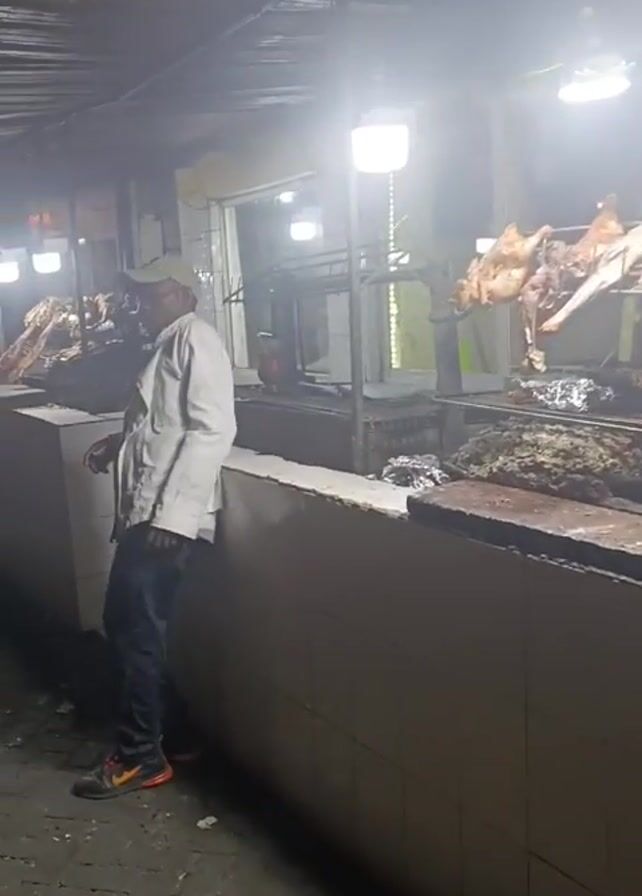 roadside restaurant at night, where whole lamb carcasses are being roasted on spits. A man in a white jacket and cap is leaning against the counter, looking towards the camera. Another person in similar attire walks past him towards the cooking area. The restaurant is illuminated by bright overhead lights. The ground is paved with grey bricks. In the background, other customers are visible. There are decorative orange lights strung above the establishment.