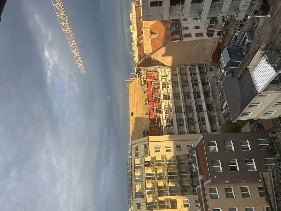 This image presents an aerial urban landscape in Strasbourg, France, under a partly cloudy sky with directional sunlight. In the midground, a multi-story building is under active construction, fully enveloped in metal scaffolding. This structure features visible red support beams and a newly framed wooden roof, illuminated by direct sunlight. To the left, a modern apartment building with multiple balconies and a sloped roof fitted with solar panels is prominently lit. To the right of the central construction, older residential buildings with traditional red-tiled roofs and dormer windows are visible, some with red window shutters. The skeletal concrete frame of another new building is partially visible on the far right. Extending across the upper right portion of the frame is the yellow lattice boom of a large tower crane. The foreground shows various lower building rooftops, including one with a small blue shed and another with green mossy vegetation. Strong shadows indicate either early morning or late afternoon light conditions.