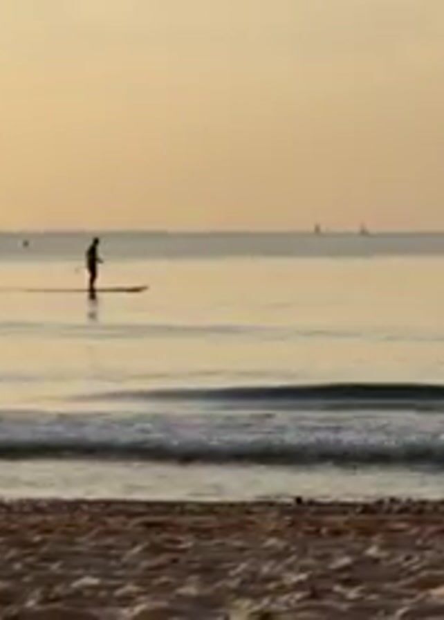 The scene depicts a beach at what appears to be sunrise or sunset, given the warm, golden light. In the foreground is a sandy beach with visible textures and damp areas closer to the water. Small waves are gently lapping at the shore. In the middle ground, a person is stand-up paddleboarding on the calm water, using a paddle to propel themselves forward. Several small sailboats are faintly visible in the distant background, adding to the tranquil seascape. The horizon is clear, and the overall atmosphere is serene.