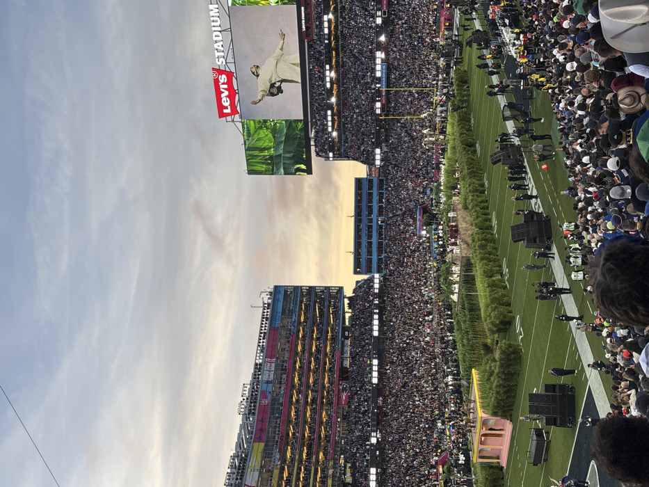 An outdoor stadium is filled with spectators. Levi's Stadium logo and a performer's image are displayed on the large screen. The football field is visible, with some equipment and personnel. The sky is pale blue with some light clouds.