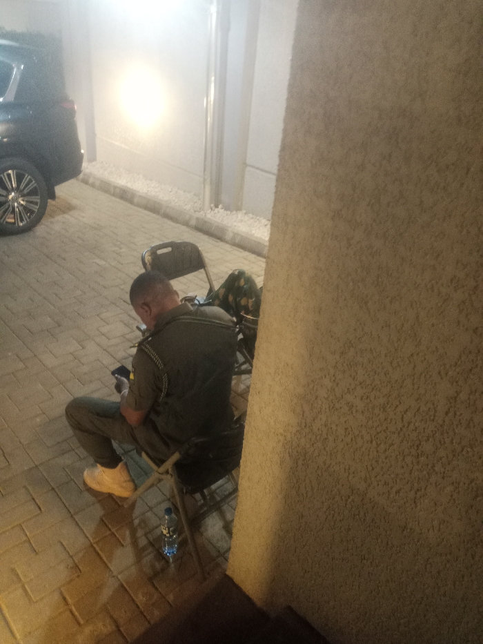 A security guard wearing a dark green uniform sits on a chair outside, engrossed in his phone