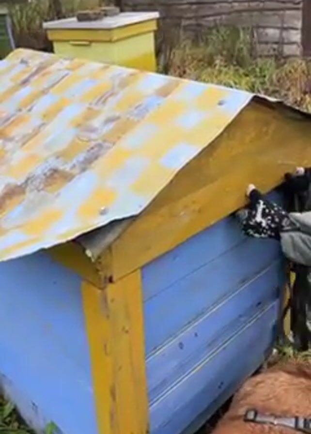 The video begins with a medium shot of a blue and yellow beehive. A person wearing gloves opens the lid of the beehive, revealing the interior, which contains several frames. The camera zooms in to display the inside of the hive in detail. A reddish-brown dog is standing near the hive throughout the video. The scene takes place outdoors in a grassy area, with a building and other beehives visible in the background.