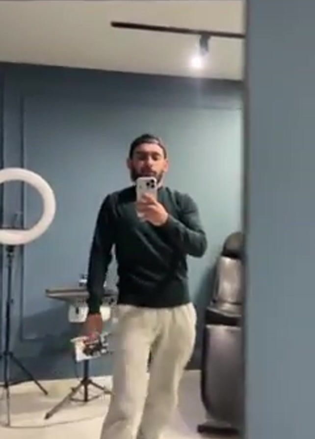 A man takes a selfie in a room with a blue wall, a black treatment chair, and a ring light