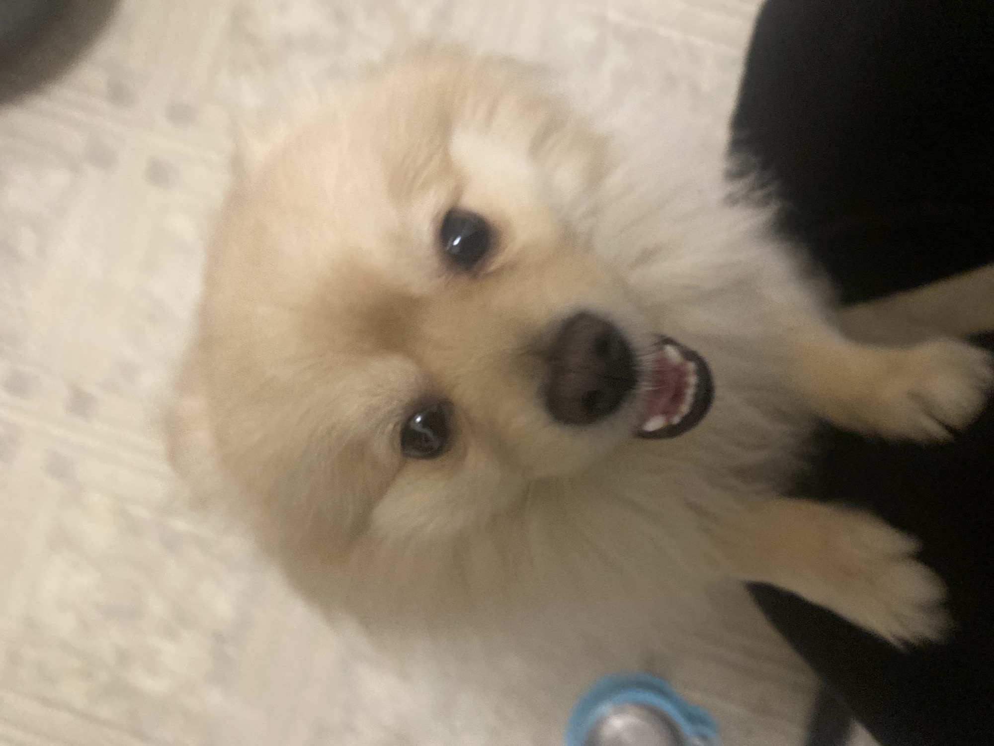 A close-up, slightly angled upward shot shows a cream-colored Pomeranian dog