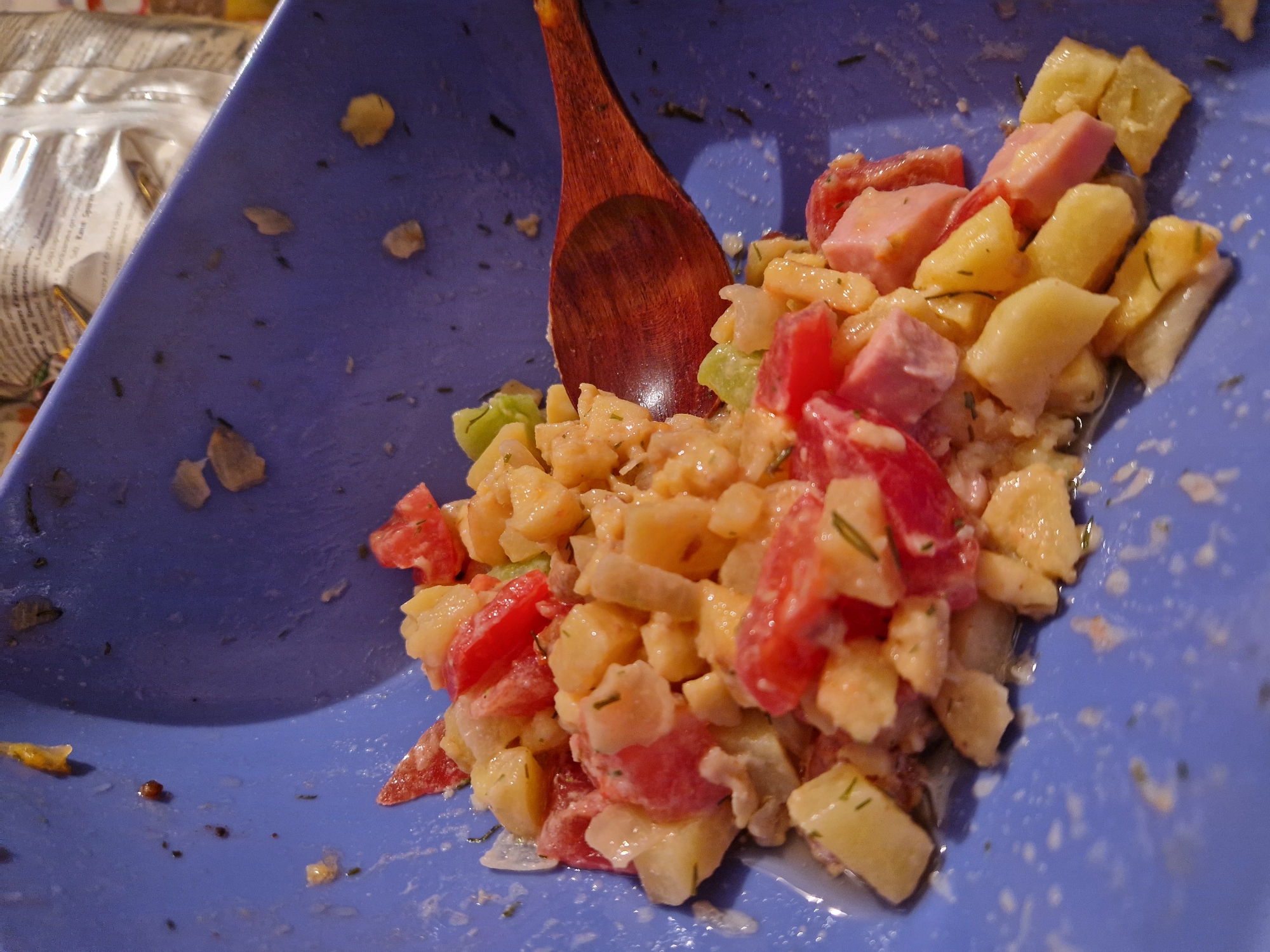 This image, taken in Lovech, Bulgaria, depicts a partially consumed salad contained within a matte blue bowl. The primary components of the salad visible are diced, yellowish-white potato pieces, bright red diced tomatoes, and diced pink processed meat, consistent with ham or sausage. Fine green herb specks, indicative of dill, are distributed throughout the mixture. A creamy, white dressing or liquid coats the ingredients and is present at the bottom of the bowl. A dark brown wooden spoon is partially submerged in the salad, positioned diagonally from the upper right, with its handle extending towards the bottom left of the image frame. The interior surface of the blue bowl shows residual food particles and splatter marks. The background is out of focus, revealing a blurred light-colored object, possibly crinkled food packaging with indistinct text, suggesting an indoor setting. No individuals are visible.