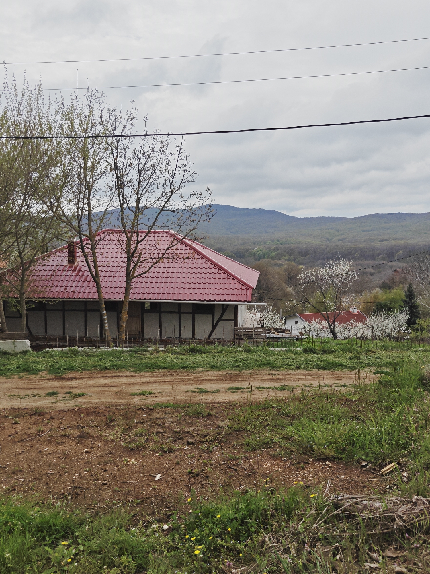 The image presents a view of a rural landscape with a house prominently featured, likely located in or near the city of Izgrev, Bulgaria, given the prompt's indication. The house has a distinctive red tile roof and a light-colored facade, possibly of a timber-frame design. Trees, mostly bare or just beginning to bud, stand near the house and along the roadside. In the distance, there are hills or mountains covered in a dense forest, with a cloudy sky above. The foreground is characterized by an unpaved dirt road, with patches of green grass and wildflowers growing on the sides. Overhead, power lines stretch across the sky. No people are directly visible in the scene. Other houses are visible in the background. The environment appears to be transitional between late winter and early spring.