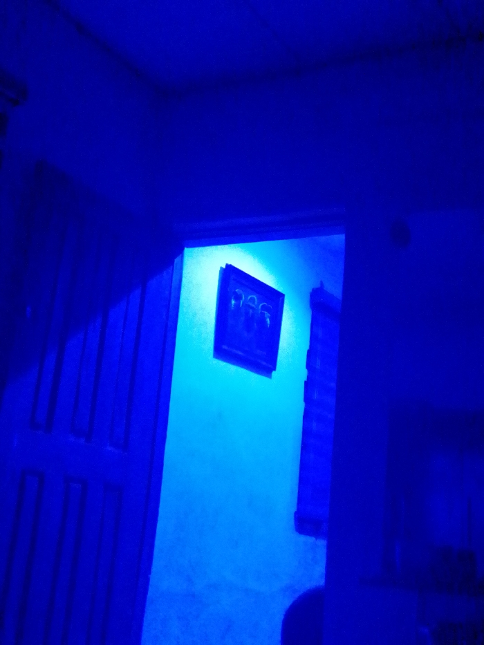 The image displays an interior scene, likely within a residential or commercial building, in Unknown, Unknown. The entire environment is saturated with intense blue light, rendering color and fine details difficult to ascertain. In the left foreground, a dark blue, paneled door or wall section is visible. A central doorway opens into an adjacent room or hallway. Through this opening, a lighter blue wall is illuminated, featuring a framed picture hanging at a slight angle, depicting three indistinct dark figures or heads. To the right of the picture, a vertical structure with horizontal elements, possibly blinds on a window or a similar fixture, is present. No individuals, actions, or specific interactions are visible.