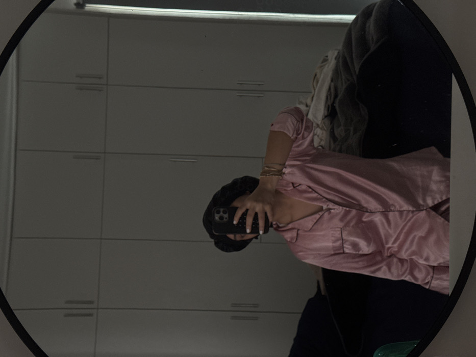 An oval mirror captures a reflection of an individual taking a selfie indoors, located in Komchén, Mexico. The subject is partially visible, obscuring their face with a black smartphone, likely an iPhone, held in their right hand. The phone exhibits a three-lens camera array on its rear. The individual wears a pink satin pajama top with black piping and a dark, possibly black, sleep bonnet. The visible right forearm is accessorized with multiple stacked thin bracelets, and the fingernails are painted white. The reflected background depicts a room with light grey or off-white built-in cabinetry featuring vertical handles, suggesting a wardrobe or storage unit. Dark bedding or fabric is visible on the left side of the reflection, with a small portion of a green object partially obscured. A vertical strip of brighter light on the far right indicates a window or doorway.