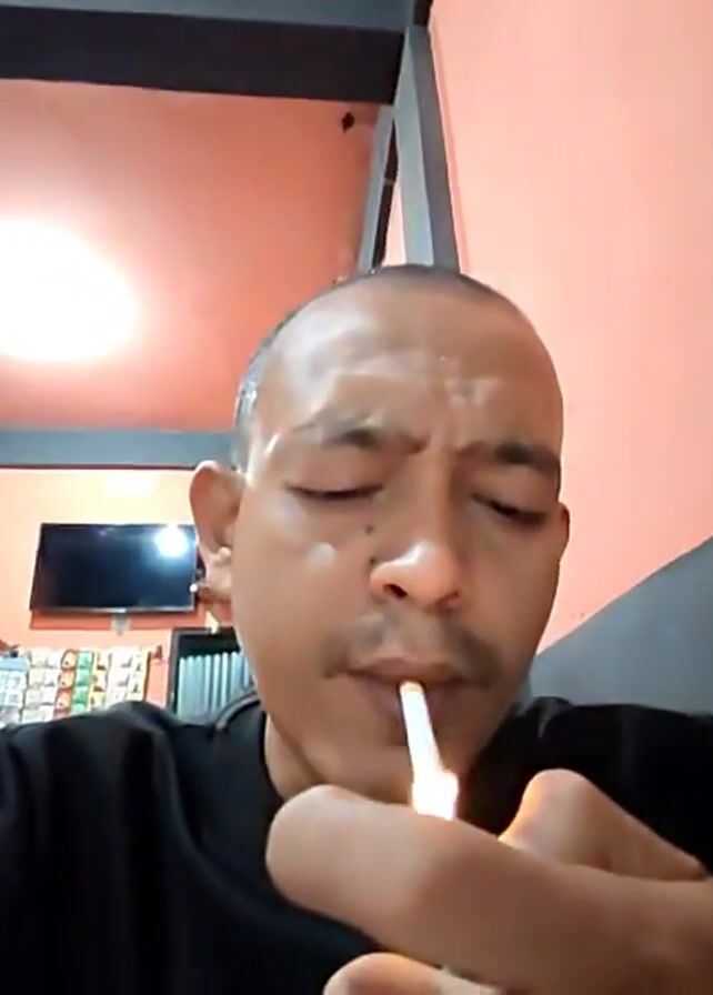 A close-up video shows a light-skinned man lighting a cigarette. He is wearing a black t-shirt and has a shaved head and a mustache. He lights the cigarette with a lighter in his right hand, then takes a puff and exhales smoke directly towards the camera. The background features a wall painted in a peachy hue and a drop ceiling. A television and snack display are visible in the background.