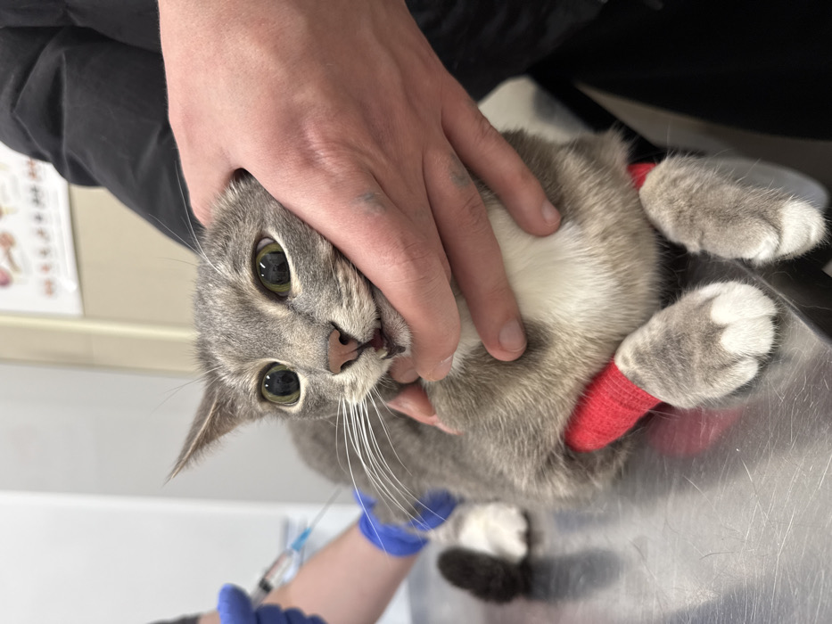 The image depicts a veterinary procedure taking place in the city of Reutov, Russia. A grey tabby cat, with a white chest and paws, is positioned on a metallic examination table. The cat's pupils are dilated, and its ears are flattened, indicating distress; its mouth is slightly open, revealing teeth and a dark spot on its lower lip. Both of the cat's front paws are wrapped in red cohesive bandages. On the left, a person wearing blue medical gloves is seen administering an injection into the cat's left hind leg using a syringe containing a clear liquid. On the right, another person, with bare hands (one hand possibly showing a tattoo) and wearing dark clothing, is restraining the cat by its head and upper body. The background consists of a white wall, a dark surface, and a partially visible medical chart or poster with anatomical diagrams.
