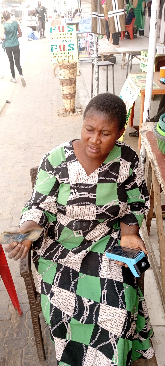 An adult female is seated outdoors on a brown woven chair on a paved street in Kwachiri, Nigeria. She wears a long-sleeved dress with a distinctive green, black, and off-white checkered pattern featuring chains and stylized 'F' shapes. Her short dark hair is visible, and her facial expression suggests concentration, with her mouth slightly open. In her left hand, she holds a stack of folded paper currency. Her right hand grips a light blue and black Point of Sale (POS) terminal. The background reveals a bustling street scene. To the immediate left of the subject, part of a red chair is visible. Further back, a "POS TRANSFER WITHDRAW DEPOSIT" sign, displaying green and red text, stands prominently on a tall, cylindrical woven wicker base. Beyond the sign, two individuals are visible walking: an adult female in a dark green top and black leggings walking away, and an adult male in a dark t-shirt walking further into the background. To the right of the subject, a wooden table-like structure and a small black stool are visible. A green and black bowl rests on the table. Hanging textiles and a "MR POOL" barber shop sign are discernible further back on the right. The ground is paved with interlocking grey blocks. The scene is brightly lit by daylight.