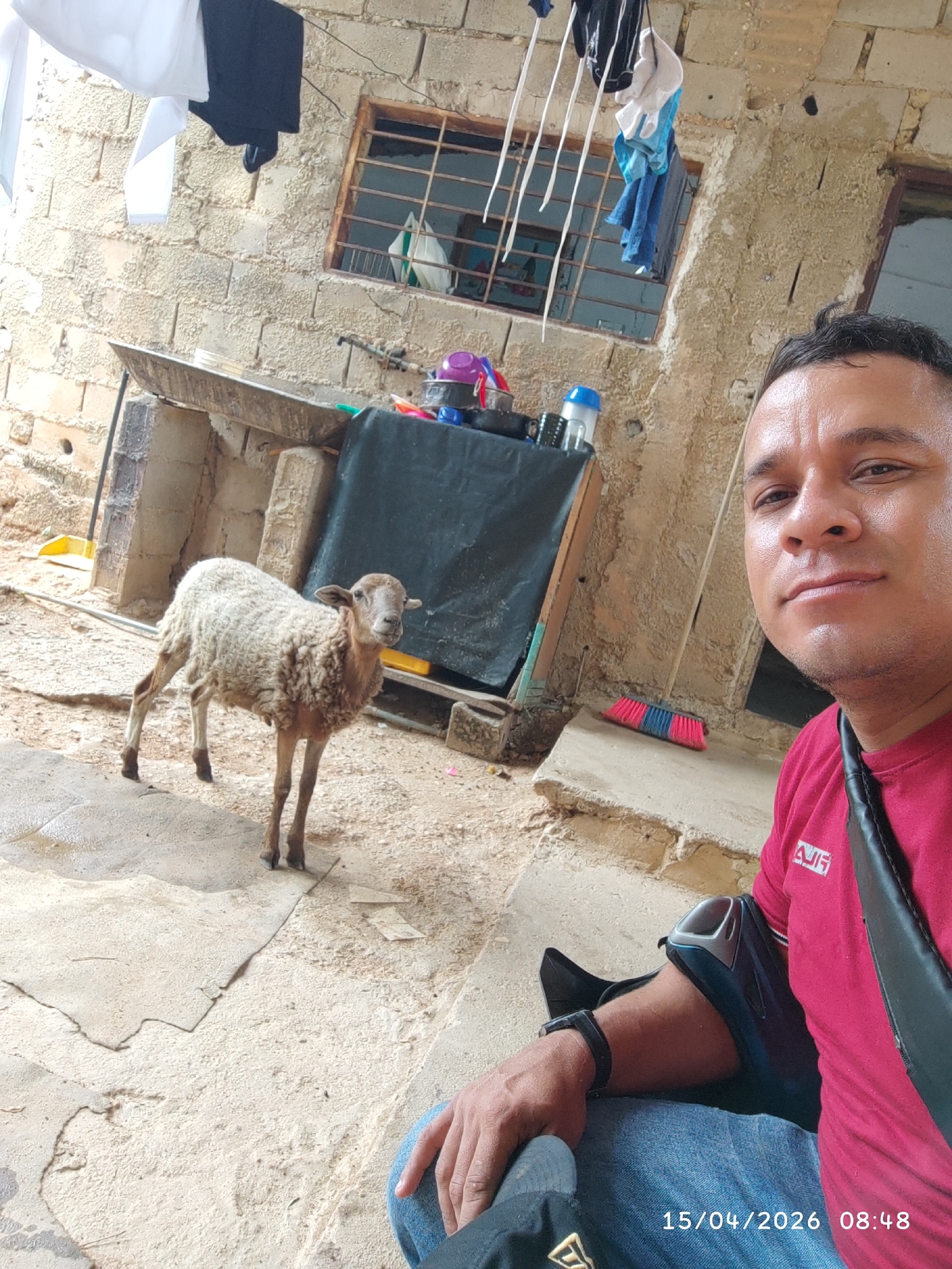 man taking a selfie in what appears to be a backyard or outdoor area in Tinaquillo, Venezuela. The man is wearing a red shirt and blue jeans, and a black bag. A lamb is standing nearby, looking towards the camera. The background includes a building made of concrete blocks, with clothes hanging on a line. There is also a window with bars and a table with various items on it. The date and time stamp on the image is 15/04/2026 08:48.
