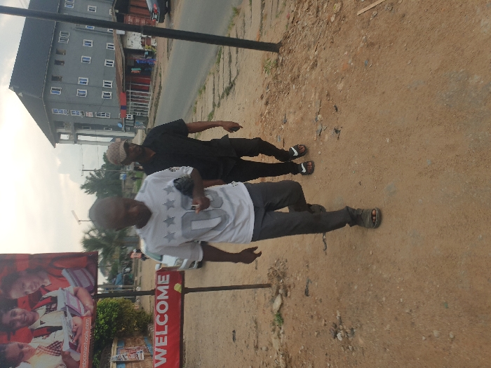 The image depicts an outdoor urban scene in Aba, Nigeria, under an overcast sky