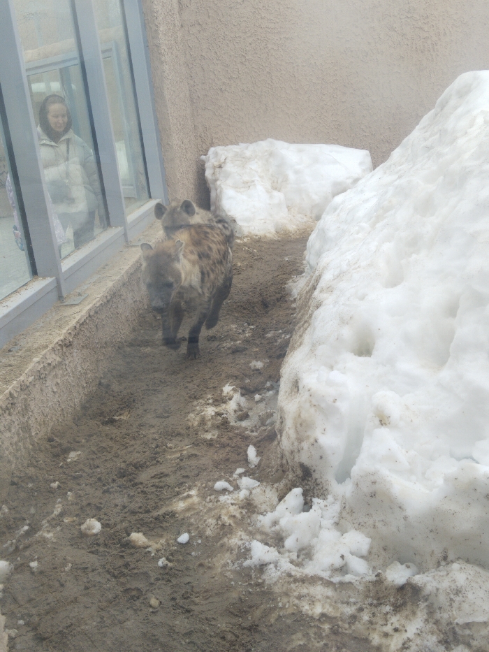 The image captures a winter scene within an animal enclosure at the Perm Zoo, Perm, Russia. Two spotted hyenas, one positioned slightly behind and above the other, walk from left to right across a muddy, packed earth pathway. The ground exhibits visible footprints and scattered patches of melting, dirty snow. To the immediate left, a clear glass barrier, framed by grey supports, separates the enclosure from a public viewing area. A female individual, approximately 20-30 years old, with dark hair, wearing a light-colored puffer jacket, is visible through the glass, looking into the enclosure with a slight smile. To the right of the hyenas' path, a large, irregularly shaped mound of snow, mixed with dirt, forms a natural barrier or landscape element. A textured, light beige concrete wall serves as the background for the enclosure.