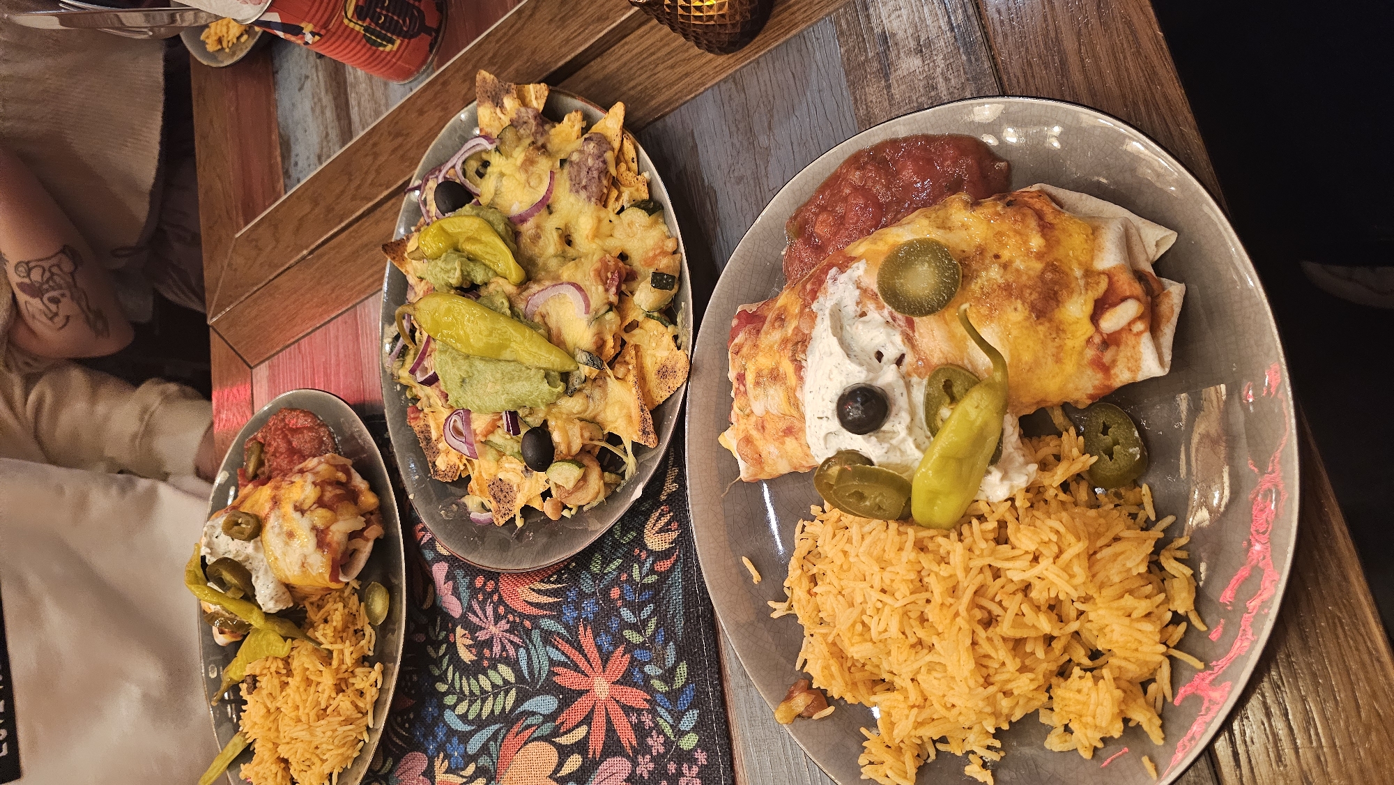 The scene depicts a dining experience in a restaurant located in Aschaffenburg, Germany. Three plates of Mexican-style food are presented on a dark-stained, multi-planked wooden table. In the foreground, a grey plate holds a cheese-covered enchilada or burrito, topped with a dollop of white cream, a single black olive, several slices of green jalapeño peppers, and one whole green pickled pepper. To its left is a mound of orange-colored rice, and to its right, a portion of red salsa. Centrally positioned, a second grey plate contains a large serving of nachos. These tortilla chips are covered with melted cheese, chopped red onions, black olives, green zucchini pieces, and a generous layer of green guacamole, garnished with two whole green pickled peppers. Partially visible in the background, a third grey plate presents a dish identical to the foreground plate. Two individuals are partially visible in the upper portion of the image. The person on the left wears a white long-sleeved top. The person on the right wears a light beige knitted sweater, with a dark tattoo visible on their right forearm. The table features a rectangular fabric placemat with a vibrant floral pattern in red, orange, green, and blue. On the right side of the table, a red cylindrical decorative item with an illustration is partially visible, alongside an amber-colored, textured glass candle holder emitting a soft glow. A silver utensil handle is also partially visible in the upper right. The environment is indoors, characterized by warm, artificial lighting.