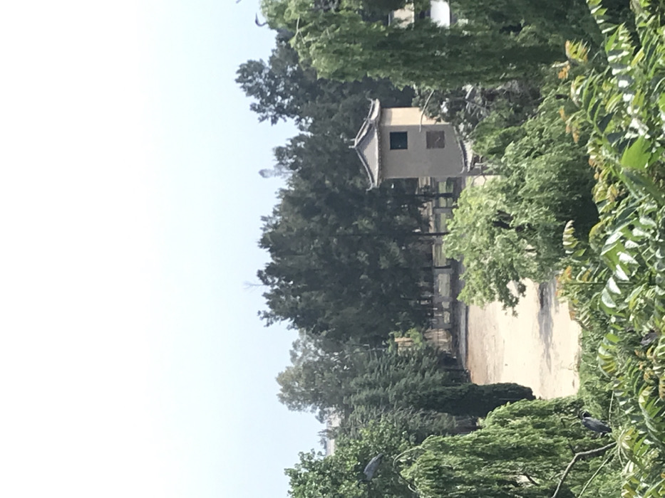 The image displays an elevated view of an outdoor scene in Midrand, South Africa, consistent with the architecture found at the Nan Hua Temple. The foreground is dominated by dense, vibrant green foliage from various trees and shrubs. A large weeping willow-like tree occupies the lower left, its long branches drooping into the frame. A dark bird is perched on an upper branch of this tree. Another large green tree partially frames the right side of the image, with a second dark bird perched on one of its upper branches. In the midground, a light-brown, two-story structure with East Asian architectural characteristics is visible. This building features a dark, tiered, hip-and-gable roof with upturned eaves. A single dark rectangular window is visible on the upper floor, with two smaller, dark rectangular features below it. The building is partially obscured by surrounding green trees. To the left and center of the midground lies a large, irregular expanse of light-colored, barren ground, appearing to be dirt or sand. A dense line of dark green, conifer-like trees forms a backdrop to this open area, extending horizontally. The background consists of additional trees under a bright, hazy sky, which is almost white at the top and transitions to a pale blue lower down. No human subjects are visible within the scene.