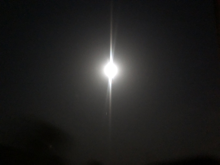 The image depicts a bright, radiant light source, likely the moon, shining intensely against a dark night sky. The light emits a vertical beam or flare, creating a dramatic effect. The surrounding area is shrouded in darkness, with only faint, shadowy shapes visible at the bottom of the frame, possibly indicating foliage or structures. The overall scene evokes a sense of nighttime mystery.