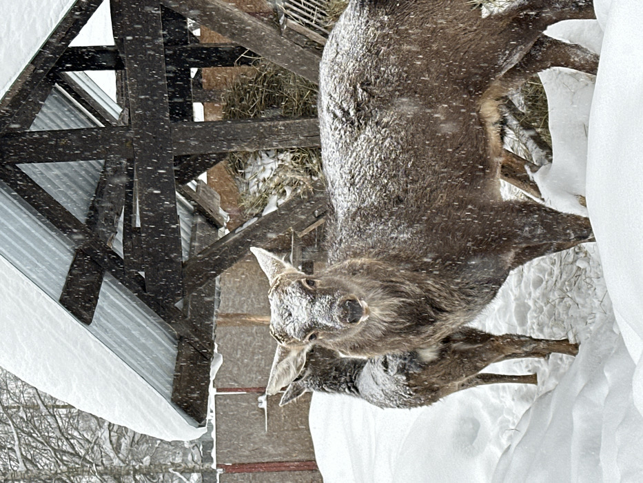 The image depicts a winter scene in Prokhorovo, Russia, during active snowfall. Two deer are present, standing in deep snow. The prominent deer in the foreground faces the viewer directly, its fur a dark brown-grey, partially covered in visible snowflakes. It exhibits small, velvet-covered antlers. Behind and to the left of the frontal deer, a second deer is partially visible, facing away. In the background, a wooden feeding structure or shelter with a corrugated metal roof, also covered in snow, contains dry hay. A wooden fence runs along the perimeter behind the feeder. Bare trees are discernible in the distant background. The ground is uniformly covered in a thick layer of fresh snow, and numerous individual snowflakes are falling through the air.