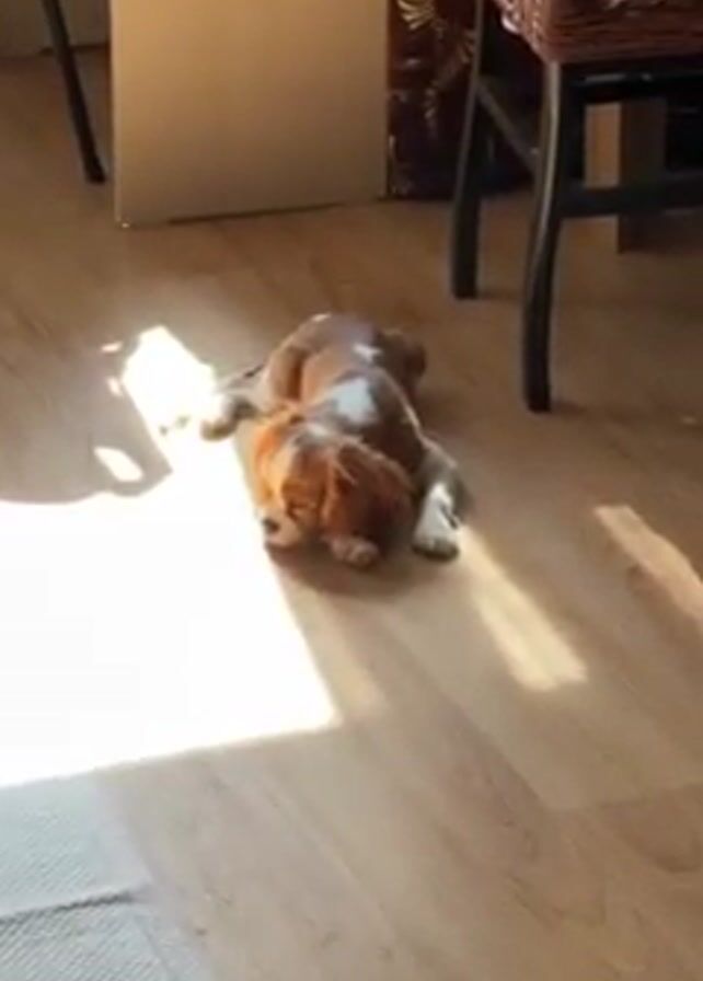 A small, tan and white Cavalier King Charles Spaniel is lying on a light brown, wood-look floor in a patch of sunlight