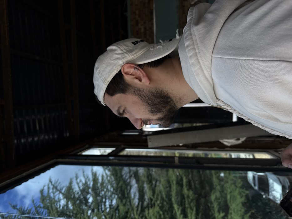 A male individual is depicted in profile, looking upwards and to the left, positioned indoors beside a large window. He wears a light-colored, distressed baseball cap reversed, with "BALENCIAGA" visible on the side, and a light-colored hooded sweatshirt. He has dark hair, a well-trimmed beard, and a small three-line tattoo on the outer helix of his left ear. A thin gold-colored chain is visible around his neck. His right hand, partially visible at the bottom, holds a dark-colored smartphone. The indoor environment includes a dark ceiling with visible wooden beams and a dark-framed window. To the individual's right, the background shows signs of an unfinished or renovated space, with exposed brick or concrete and a vertical light-colored board leaning against a structure. Through the window, an outdoor scene is visible, featuring dense green conifer trees under a partially cloudy blue sky. A light-colored sedan is partially visible, parked on a surface that appears to be a road or driveway at the lower left. The scene is located in Dilijan, Armenia.