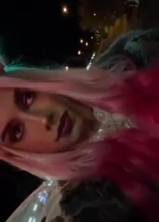 A person with pink hair and heavy makeup looks at the camera while walking down a street at night. The person is wearing a dark jacket and a top with white fringe. There are streetlights and buildings visible in the background. The camera is held close to the person's face and is moving slightly.